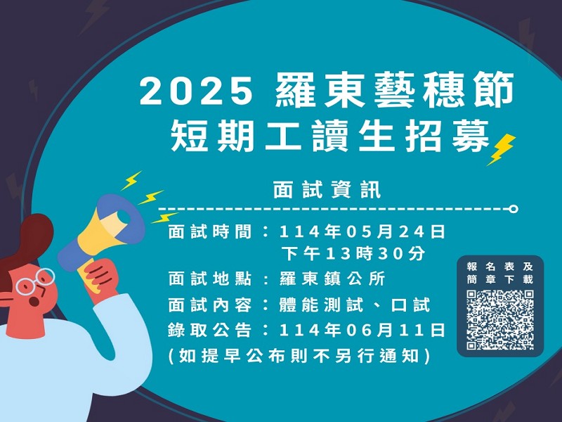報名方式:下載 「2025羅東藝穗節 短期工讀生招募簡章」,並填寫報名表格及筆試資料,回傳至報名窗口,相關規定請參閱簡章。