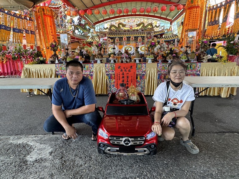 徐小姐表示,之前「蓮花太子」曾向她要一部車,她答應等有錢就買一部車送給它,於是利用中秋節連假 ,「蓮花太子」(哪吒三太子)當司機、旁邊坐著福德正神土地公來到四結福德廟參拜。