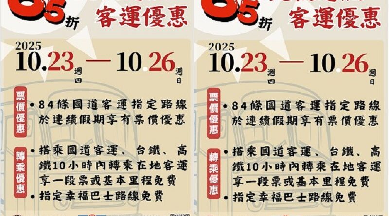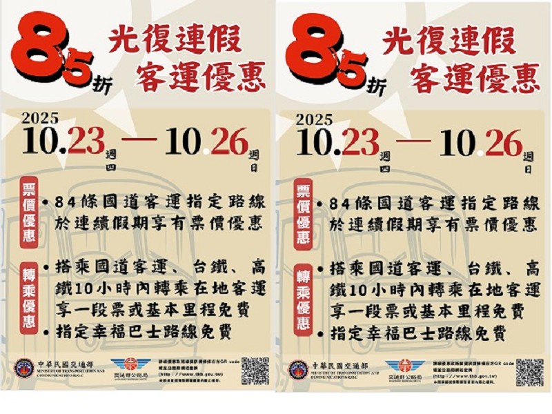 宜蘭監理站表示,光復節3天連續假期(10月24日至10月26日)即將到來,預計宜蘭地區將湧入大量返鄉及旅遊車潮,為鼓勵民眾多加利用公共運輸,交通部公路局於10月23日0時至10月26日24時推出客運票價及轉乘優惠,並協調客運業者機動加開班次,搭配國道5號大客車優先措施,將能大幅縮短行車時間,有效避免塞車與停車困擾,讓民眾輕鬆暢遊宜蘭,省錢又省時。