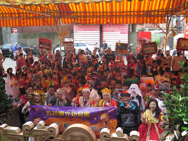 五結鄉立幼山石園小朋友們萬聖節踩街活動在五結奠安宮前集結。