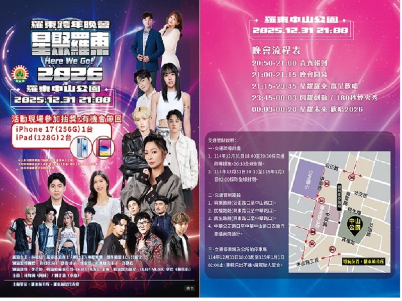 2026羅東跨年晚會將於12月31日(星期三)晚間9時,在羅東中山公園廣場熱鬧登場。今年以主題「星聚羅東 Here We Go!」打造最亮眼的跨年夜,集結9組歌手與樂團輪番演出,並於倒數後施放長達180秒的跨年煙火秀,搭配抽獎活動送出iPhone 17與iPad等超人氣3C大獎,邀請民眾一同迎向充滿希望與光芒的2026年。