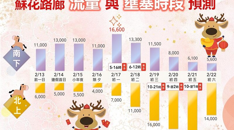 115年春節連續假期將自2月14日(週六)至2月22日(週日)止,共計9天。公路局東區養護工程分局表示,預估假期前段南下返鄉車流將逐日增加,其中2月17日(大年初一)將出現南下最大車潮,單日交通量約16,600輛次;而北上返工高峰則落在2月21日(初五),北上交通量預估達21,000輛次,提醒用路人提前規劃行程、避開尖峰時段。
