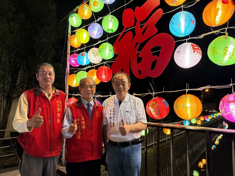 五結鄉長沈德茂(中)、鎮安村長張朝松(左)、鎮安社區發展協會理事長陳長義感謝社區志工製作繽紛亮麗燈籠,增添社區春節歡樂喜氣。