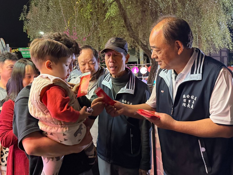 鎮安社區發展協會理事長陳長義(右)發送紅包給前來賞燈鄉親。