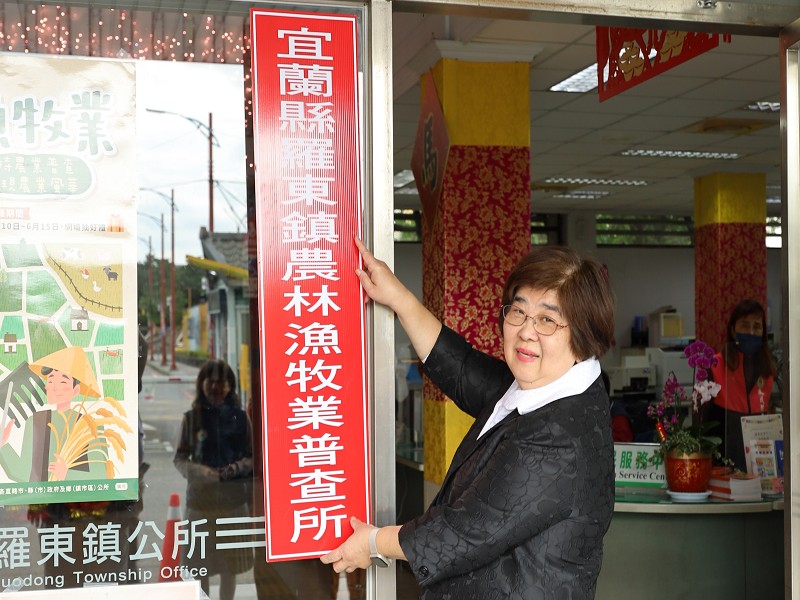羅東鎮長吳秋齡將農林漁牧業普查所招牌正式掛上。