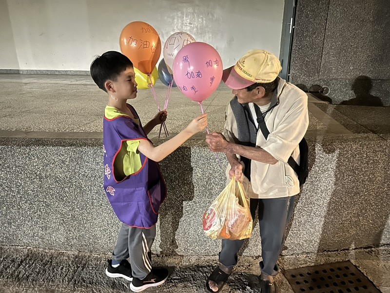 隨後,一行人走訪羅東火車站及周邊公園等寒士棲息地,逐一分送物資與餐食,並將象徵鼓勵與祝福的「加油氣球」送到寒士手中。寒士順伯接過氣球後笑得合不攏嘴,頻頻稱讚「金古錐」,也讓兒童節前夕的宜蘭街頭,多了幾分溫馨與笑容。