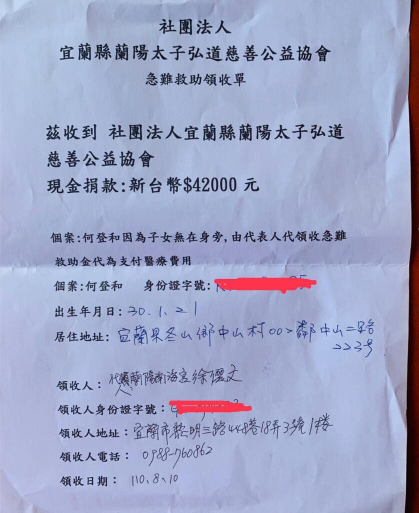 案名:何登和(居住冬山)案由:案主今年實歲80歲、目前在羅東博愛醫院、因無孩子陪伴在側,跌倒右肩脫臼骨折有糖尿病引發蜂窩性組織炎,目前仍住院治療中,因實無費用可繳納醫療費,後續仍需到安養院由專人照顧,感恩大家的發心;可以讓一位長者先安心治療。社團法人蘭陽太子弘道慈善公益協會募款所得共$42000感恩每位善心人士邱玉錦、陳素雲、黃靖芬、廖冠霖、鄭漢章、陳智化、李宜蓁、莊淑鏡、陳寬裕、莊沛縈、鍾文強、彭秀玉、王湘淇、洪淑芬、石義章、張少滐 、王淑甄、林宏勳、林楚洋、李郭春美、梁惠淑、陳力綺、陳少甫、吳桂 、林育煬蕭妙慧、潘月娥、陳美華、李啟良、有緣人感恩各位的愛心善款已全數送達至受捐戶